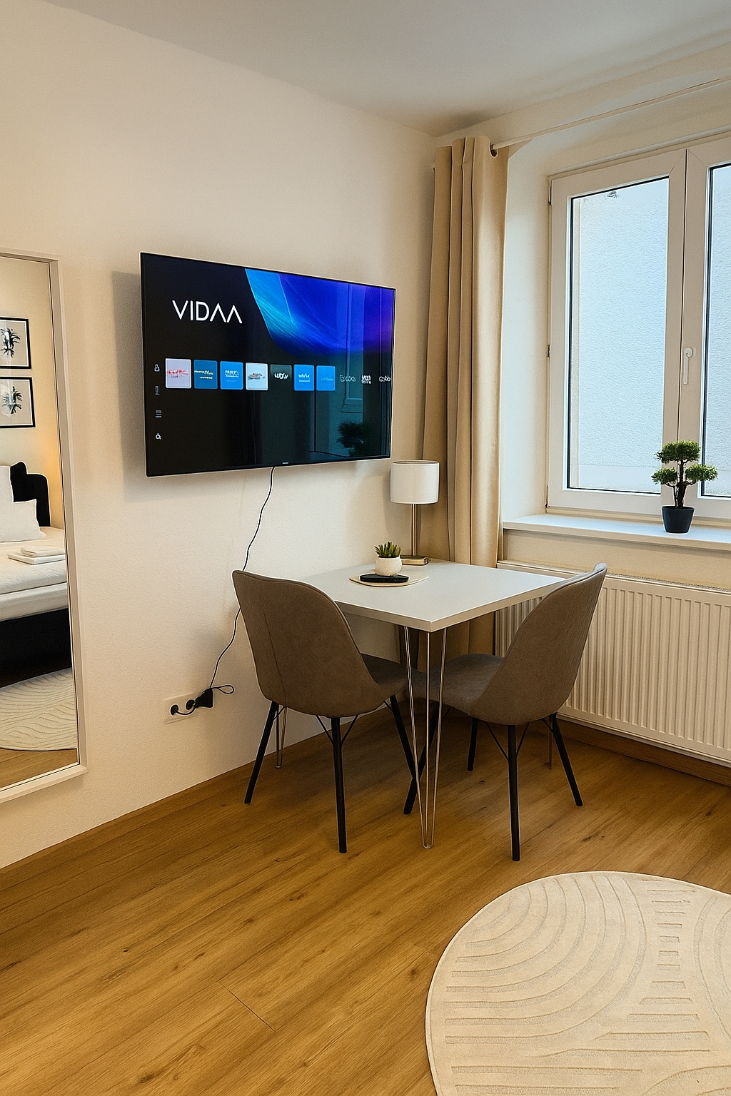 Das Design ist hell und gemütlich, geprägt von warmen Beigetönen, Teppichen und dekorativen Elementen, die eine einladende Atmosphäre schaffen. Die voll ausgestattete Küche bietet alles Nötige für den täglichen Bedarf, während der Wohnbereich mit einem 50-Zoll-Smart-TV zum Entspannen einlädt.