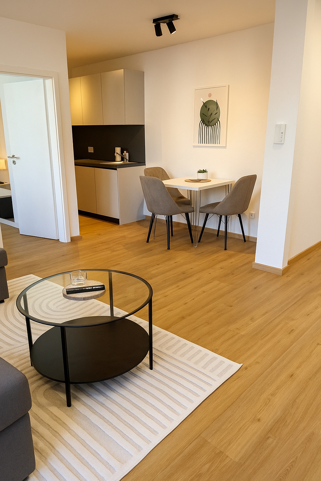 Das Design ist hell und gemütlich, geprägt von warmen Beigetönen, Teppichen und dekorativen Elementen, die eine einladende Atmosphäre schaffen. Die voll ausgestattete Küche bietet alles Nötige für den täglichen Bedarf, während der Wohnbereich mit einem 50-Zoll-Smart-TV zum Entspannen einlädt.